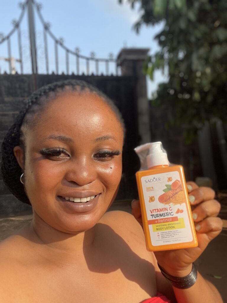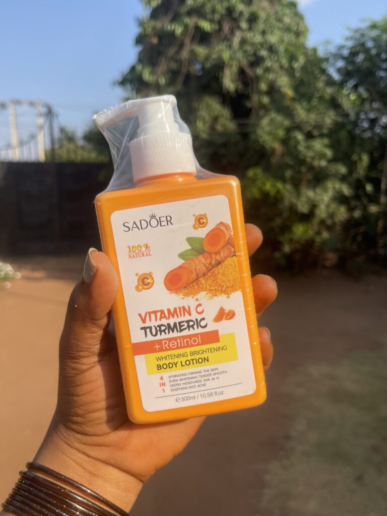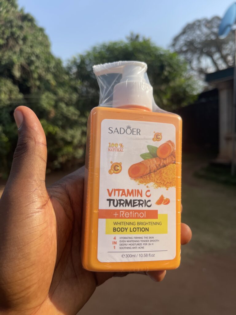 Sadoer Vatamin C Body Lotion is a a powerful blend of natural tumeric and other botanicals and advanced skin science, made to whiten and brighten dark skinwithout dark knuckles — all while keeping your skin nourished, smooth, and glowing.